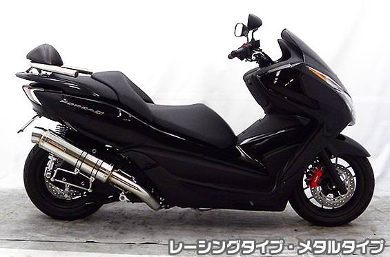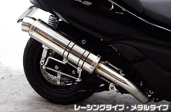 ■受注生産商品となっており、商品手配後 2週間程度入荷にお時間を頂きます。■※平成22年4月1日より施行された認証制度に適合する認証マフラーではありません。ご理解の程よろしくお願い致します。大柄なビッグスクーターの車体にマッチするよう、極太のエキパイ60.5mm径、サイレンサー110mm径という仕様で、バランスのとれた仕上がりなっています。排気口径は90mm径です。メタルタイプはステンレスをバフ磨きでピカピカに仕上げています。路面と垂直に裁ち落とし極力シンプルに仕上げた「レーシングタイプ」サイレンサーの固定にはサイレンサーバンドを採用し、バフ仕上げを施したステンレス製丸棒で組んだステーを介して固定しておりますので、従来のステーの固定より車体と調和した高級感あふれるマフラーです。オールステンレス製で、エキパイからサイレンサーまでバフ仕上げを施しています。低中速を落とすことなく高回転でスムーズに回り扱いやすい設定になっています。振動防止のためサイレンサーとエキパイが2分割となる安心設計になっています。サイレンサーは、2点止めになっていますのでしっかりと固定でき、耐久性にも優れています。無加工ボルトオンにて装着できますので、必要な工具があれば簡単に取り付けできます。(取り付けに必要なボルト類は全て付属しております。)サイレンサーはストレート構造ではなくフロント部にパンチングを施した作りになっていますので、音量は静かめに抑えられており近所迷惑になる事無く安心して走行できます。バッフル装着時 約89db(法定規制値内音量)バッフル非装着時 約92db になります。