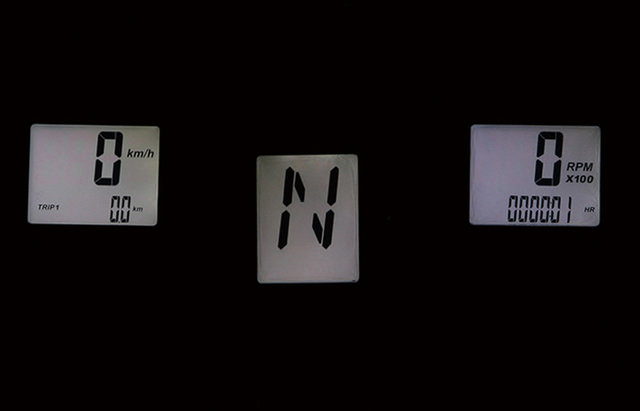 デュアル表示のトリップメーターと最高速記憶機能、時計表示(12h)機能を装備。