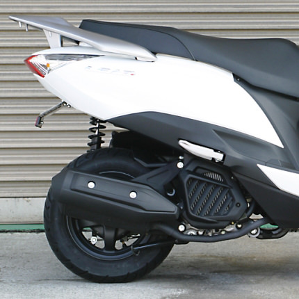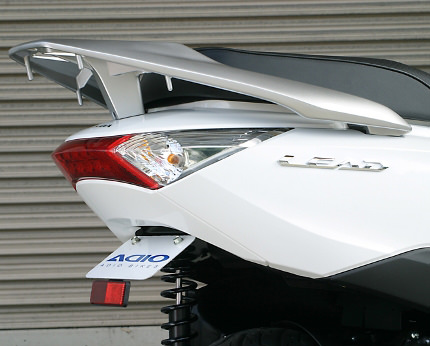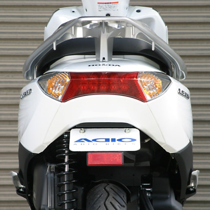 ※純正パーツのカット加工等は一切ありません。純正のリアフェンダーを取り外し、無加工で付属のナンバーステーが取り付けできるフェンダーレスキットです。全体にまとまり感のあるリード125ですが、やはり気になるのは、リアフェンダー。アディオのフェンダーレスキットはボディとナンバープレートを極力近づけ、またナンバー灯も外からはまったく見えない位置にレイアウトしているため、スッキリとシンプルなスタイルとなります。ボディデザインとのマッチングも申し分ありません。リアフェンダーを取り外し、ボディとナンバープレートの位置バランスを最適にレイアウトしたフェンダーレスキットです。ナンバー灯も純正を使用しますが、完全にカウルの中に設置し、外からはまったく見えません。そのことにより、まとまりのあるバランスのいいリアスタイルが実現できます。純正のリアフェンダーを取り外し、キット付属のナンバーステーにナンバー灯を移植。完全ボルトオンで取り付けできます。リフレクターステーも別体式とし、純正のリフレクターが取り付けできます。またリフレクターステー自体を取り外し、社外製のリフレクターを取り付けることもできます。