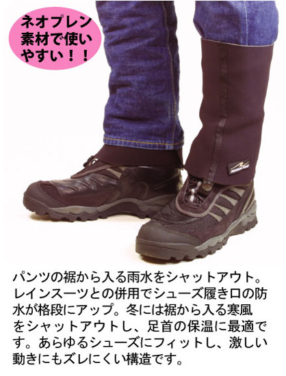 パンツと靴の隙間から入る雨水、寒風をシャットアウト。防水・防汚対策に、防寒対策に、バタ付防止にと、一人三役。一年中使える賢い便利アイテムです。ベルクロフリーアジャストで、どんなシューズ・ブーツにもジャストフィット。