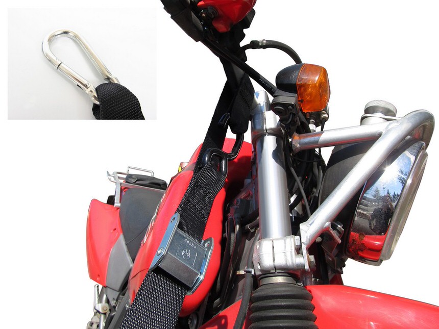 ※モニターの環境により、画像の色が実物と若干異なって見える場合がございます。カラー:ブラックサイズ:全長180cm×幅40mm耐荷重量:300kg片側のフックにはビニールコーティングが施されており車体を保護します。反対側のフックはカラビナ式になっているので万が一ベルトが緩んだ際にも外れにくい作りになっています。40mmの幅広いカムバックルを採用しており車体の大きな横揺れにも対応しています。片側フックの横には延長バンドが縫いこまれており、積載中に延長バンドを探す手間が省けます。