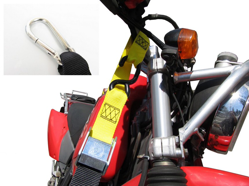 ※モニターの環境により、画像の色が実物と若干異なって見える場合がございます。カラー:イエローサイズ:全長180cm×幅40mm耐荷重量:300kg片側のフックにはビニールコーティングが施されており車体を保護します。反対側のフックはカラビナ式になっているので万が一ベルトが緩んだ際にも外れにくい作りになっています。40mmの幅広いカムバックルを採用しており車体の大きな横揺れにも対応しています。片側フックの横には延長バンドが縫いこまれており、積載中に延長バンドを探す手間が省けます。