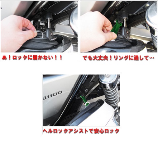 ※本製品はヘルメットロックを使用しやすくする補助的商品です。防犯効果を高めるものではありませんので、長時間のご使用はお控え下さい。※こちらの商品は画像中オレンジになります。ヘルメットロックに掛け辛い、ベルトの短いヘルメットも楽々です!カラビナで取り外しも簡単です。キジマ製ヘルメットロックは勿論、平型の純正ロックにも使用可能です。ヘルメットロックについているDリングで直径22mmのスペースがあれば使用可能。付属のカナビラの色はガンメタです。製品はアルマイト処理につき写真の色合いとは異なります。