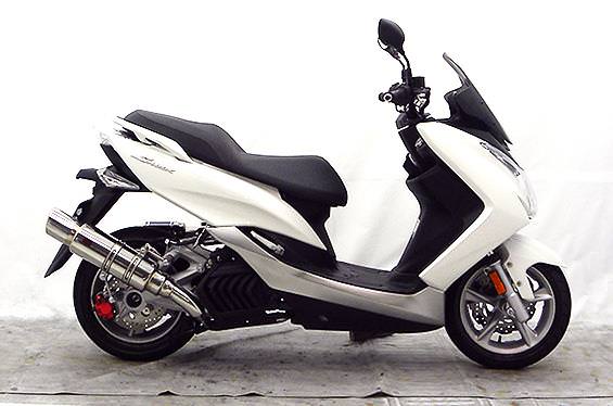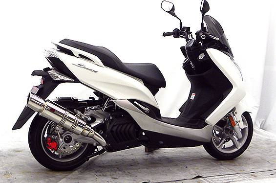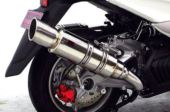■受注生産商品となっており、商品手配後 2週間程度入荷にお時間を頂きます。■※平成22年4月1日より施行された認証制度に適合する認証マフラーではありません。ご理解の程よろしくお願い致します。サイレンサーは新設計構造を採用し軽量化を図っています。出口はインナーカールエンドタイプで、厚みのある上品な仕上がりになっています。サイレンサーバンドにはスリットタイプを採用してデザインにもこだわっており、従来のステーの固定からサイレンサーバンドで固定することにより、車体と調和したニュースタイルのマフラーを完成させました。オールステンレス製で、エキパイからサイレンサーまでバフ仕上げを施しています。ビッグスクーターにマッチするようエキパイ径60mm、サイレンサー径125mmの仕様で、装着時の全体的なバランスがとれた仕上がりとなっています。低中速を落とすことなく高回転でスムーズに回り扱いやすい設定になっています。振動防止のためサイレンサーとエキパイが2分割となる安心設計になっています。サイレンサーは、2点止めになっていますのでしっかりと固定でき、耐久性にも優れています。無加工ボルトオンにて装着できますので、必要な工具があれば簡単に取り付けできます。(取り付けに必要なボルト類は全て付属しております。)サイレンサーはストレート構造ではなくフロント部にパンチングを施した作りになっていますので、音量は静かめに抑えられており近所迷惑になる事無く安心して走行できます。音量バッフル装着時 約88db(法定規制値内音量)バッフル非装着時 約92db になります。