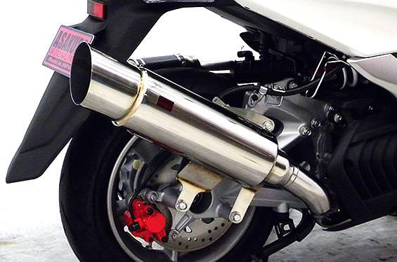 ■受注生産商品となっており、商品手配後 2週間程度入荷にお時間を頂きます。■※平成22年4月1日より施行された認証制度に適合する認証マフラーではありません。ご理解の程よろしくお願い致します。オールステンレス製で、エキパイからサイレンサーまでバフ仕上げを施しています。ビッグスクーターにマッチするようエキパイ径60mm、サイレンサー径125mmの仕様で、装着時の全体的なバランスがとれた仕上がりとなっています。低中速を落とすことなく高回転でスムーズに回り扱いやすい設定になっています。振動防止のためサイレンサーとエキパイが2分割となる安心設計になっています。サイレンサーは、2点止めになっていますのでしっかりと固定でき、耐久性にも優れています。無加工ボルトオンにて装着できますので、必要な工具があれば簡単に取り付けできます。(取り付けに必要なボルト類は全て付属しております。)サイレンサーはストレート構造ではなくフロント部にパンチングを施した作りになっていますので、音量は静かめに抑えられており近所迷惑になる事無く安心して走行できます。音量バッフル装着時 約88db(法定規制値内音量)バッフル非装着時 約92db