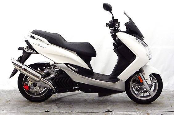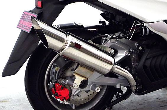■受注生産商品となっており、商品手配後 2週間程度入荷にお時間を頂きます。■※平成22年4月1日より施行された認証制度に適合する認証マフラーではありません。ご理解の程よろしくお願い致します。オールステンレス製で、エキパイからサイレンサーまでバフ仕上げを施しています。ビッグスクーターにマッチするようエキパイ径45mm、サイレンサー径115mmの仕様で、装着時の全体的なバランスがとれた仕上がりとなっています。低中速を落とすことなく高回転でスムーズに回り扱いやすい設定になっています。振動防止のためサイレンサーとエキパイが2分割となる安心設計になっています。サイレンサーは、2点止めになっていますのでしっかりと固定でき、耐久性にも優れています。無加工ボルトオンにて装着できますので、必要な工具があれば簡単に取り付けできます。(取り付けに必要なボルト類は全て付属しております。)サイレンサーはストレート構造ではなくフロント部にパンチングを施した作りになっていますので、音量は静かめに抑えられており近所迷惑になる事無く安心して走行できます。音量バッフル装着時 約88db(法定規制値内音量)バッフル非装着時 約92db