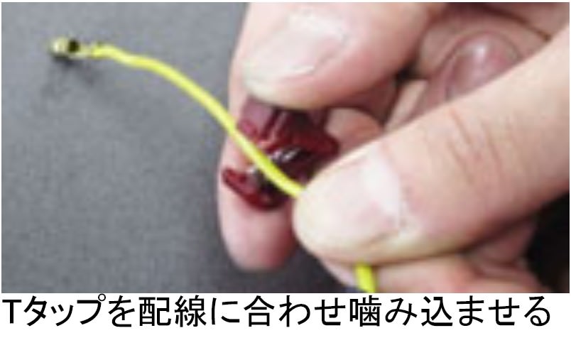 配線を切らずに分岐でき、抜き差し可能とします。・Tタップを配線に合わせ噛み込ませる。・分岐先配線の先端に平端子を圧着させる・Tタップに平端子を差し込む18-14AWG 配線対応