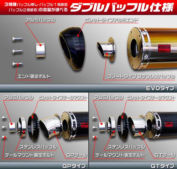 ■受注生産商品となっており、商品手配後 2週間程度入荷にお時間を頂きます。■※平成22年4月1日より施行された認証制度に適合する認証マフラーではありません。ご了承くださいませ。※サイレンサー部分だけ取り替えるスリップオンタイプの商品です。フルエキゾーストタイプのマフラーではありませんのでご注意ください。TTRタイプマフラー GPタイプ メタルバージョンです。メタルバージョンはステンレスをバフ磨きでピカピカに仕上げています。ブラックアルマイト処理を施したビレットタイプのテールマウントに、シンプルかつレーシーなイメージのGPタイプ。消音用のバッフルが2個装備されている【ダブルバッフル仕様】となっており、バッフル無し、バッフル1個装着、バッフル2個装着と3種類の排気音を選べるサウンドセレクトスタイルになっています。バッフルはステンレスタイプとアルミタイプの2種類のバッフルが装備されています。音量はバッフル2個装着時の排気音量が約88db(法定規制値内音量)バッフル1個装着時の排気音量が約90dbバッフル非装着時の排気音量が約92dbです。音質も耳障りな音でなく重低音のサウンドになっていますので、ノーマルマフラーではちょっと物足りない方にオススメです。サイレンサーはストレート構造ではなく隔壁構造になっていますので、音量は静かめに抑えられており近所迷惑になる事無く安心して走行できます。低中速を落とすことなく高回転でスムーズに回り扱いやすい設定になっています。振動防止のためサイレンサーとエキパイが2分割となる安心設計になっています。サイレンサーは、2点止めになっていますのでしっかりと固定でき、耐久性にも優れています。無加工ボルトオンにて装着できますので、必要な工具があれば簡単に取り付けできます。(取り付けに必要なボルト類は全て付属しております。)サイレンサーバンドにはスリットタイプを採用してデザインにもこだわっています。サイレンサーの固定にはサイレンサーバンドを採用し、バフ仕上げを施したステンレス製丸棒で組んだステーを介して固定しておりますので、従来のステーの固定より車体と調和した高級感あふれるマフラーです。