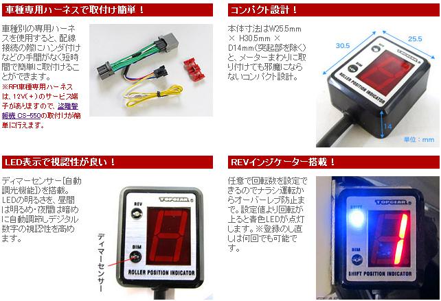 ●車種専用ハーネス付属で簡単取付け。車種別の専用ハーネスを使用すると、配線接続の際にハンダ付けなどの手間がなく短時間で簡単に取付けることができます。※RPI車種専用ハーネスは、12V(+)のサービス端子がありますので、盗難警報機 CS-550の取付けが簡単に行えます。●コンパクト設計。本体寸法はW25.5mm×H30.5mm×D14mm(突起部を除く)と、メーターまわりに取り付けても邪魔にならないコンパクト設計。●LED表示で視認性が良い。ディマーセンサー(自動調光機能)を搭載。LEDの明るさを、昼間は明るめ・夜間は暗めに自動調節しデジタル数字の視認性を高めます。●REVインジケーター搭載。任意で回転数を設定できるのでナラシ運転からオーバーレブ防止まで。設定値より回転が上ると青色LEDが点灯します。※登録のし直しは何回でも可能です。【本体】・定格電圧:DC12V・外径寸法:W25.5mm×H30.5mm×D14mm ※突起部を除く【構成部品】・本体×1・両面テープ×2(1mm厚・2mm厚 各1)※1枚は設定時の仮止め用としてご使用ください。・取扱説明書、保証書