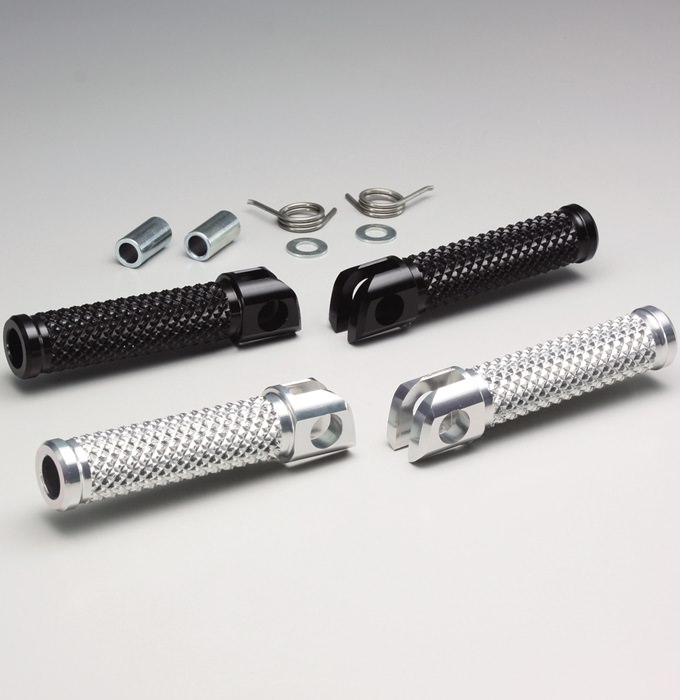 ※画像中のカラー:ブラックになります。ジュラルミン削り出しブラックアルマイトフロント用可倒式付属の強化リターンスプリングに変更する事により、ブレーキ及びチェンジ操作時のステップバーのむだな動きを抑えます。バンク角を深くするショートタイプ取付穴の中心から先端までの長さは92mm。