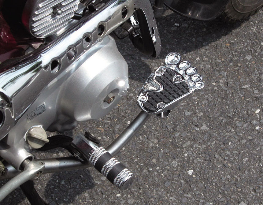 アメリカン独特のつま先を開くライディングスタイル時でも、的確にペダル操作が行える様に大型化したペダルカバーです。アルミ製で表面に滑り止め加工を施しました。