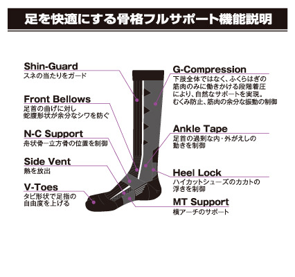 段階着圧で足を快適にする骨格フルサポートソックス。ツーリングからレースまで使用可能。【商品情報】・ライディング時に踏ん張れるつま先、タビ仕様。・適度な段階着圧によるコンプレッションでムダな筋肉のブレを抑える。・吸汗速乾ドラロン採用で履き心地満点。・スポーツ全般はもちろん日常生活でも着圧効果で快適。・ロンフレッシュ加工(天然系抗菌防臭加工)でバクテリア増殖による臭いを減少させます。ツーリングにも最適なロングソックス。その特性上、「簡単には履きにくい」 という性質がありますが、履けばわかるその機能と心地よさを、ぜひ体感ください。