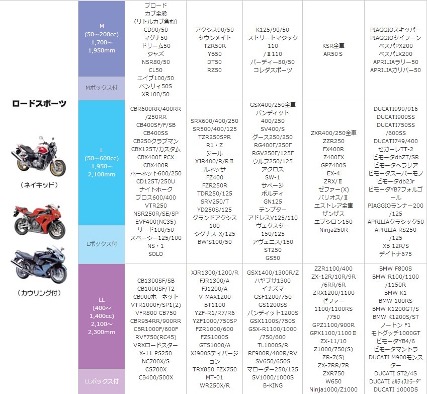 防炎、防溶バイクカバーの決定版力バー前部と上部には防炎加工を施した250デニール生地、マフラー接触部にはガラス繊維加工を施した防炎、防溶生地を使用。火が燃え広がりにくく、溶けないカバーとなっています(車両により接触する場合もございます)。前後に開閉ファスナーを採用。どの方向からもらくらく脱着。(前は止水ファスナー)前後大型スリット採用で大型ロックにも対応。全長(cm):全高(cm):全幅(cm)210:130:100タイプ:ロードスポーツ(カウリング付)排気量:50~600ccサイズ:L(50~600cc:全長1950~2100mm)【参考適合車種】ホンダ:CBR600RR/400RR/250RR、CB400SF/F/SS、CB400SS、GB250クラブマン、CBX125T/カスタム、CBX400F、VFR400R、ホーネット600/250、CD125T/250U、ナイトホーク、ブロス600/400、VTR250、NSR250R/SE/SP、RVF400(NC35)、リード100/50、スペーシー125/100、NS-1/SOLOヤマハ:SRX600/400/250、SR500/400/125、TZR250SPR、R1-Z、ジール、XJR400/R/RII、ルネッサ、FZ400、FZR250R、TDR250/125、SRV250/T、YD250S/125、グランドアクシス100、シグナス-X/125、BW'S100/50スズキ:GSX400/250全車、バンディット400/250、SV400/S、グース350/250、RG400/γ/250/γ、RGV250/γ/125/γ、ウルフ250/125、アクロス、SW-1、サベージ、ボルティ、GN125、アドレス110、ヴェクスター150/125、アヴェニス/150、ST250、GS50カワサキ:ZXR400/250全車、ZZR250、FX400R、Z400FX、GPZ400S、EX-4、ZRX/II 、ゼファー(X)、バリオス/II、エストレア、ザンザス、エプシロン150DUCATI999/916、DUCATI900SS、DUCATI、750SS/600SS、DUCATI749/400、セガーレTT-2、ビモータdbZT/SR、ビモータヘラリア、ビモータスーパーモノ、ビモータdb2Jr、ビモータYB7フォルゴール、PIAGGIOランナー、200/125、ストラーダ、APRILIAクラシック50、APRILIARS250/125、XB12R/S