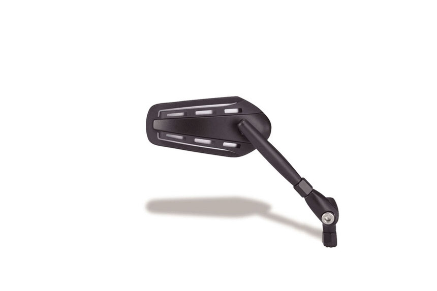 正/逆ネジ10mmスタイリッシュなアルミ製フレキシブルステーを採用。M10正ネジ・逆ネジ対応。ステー110mm。ミラーサイズ:55×120mmカラー:ブラック/ブラックシャフトの角度は水平0度~180度(11段階:15度間隔)でお好みのポジションに調整可能です。入数:1個