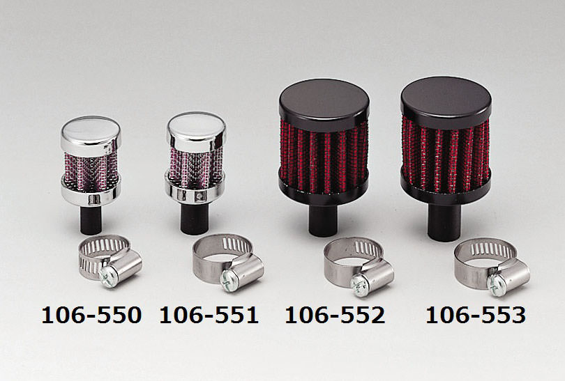 ホースエンドに装着して、オイルなどが飛び散るのを防ぐブリーザーフィルターです。また、ドレスアップ効果も高いアイテムです。固定用のバンド付。取付径12Φ フィルター部38Φ×60mm