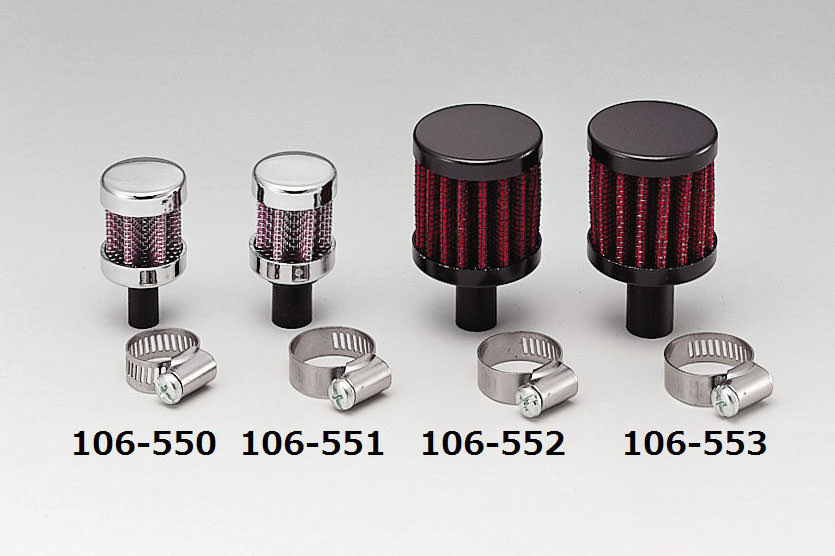 ホースエンドに装着して、オイルなどが飛び散るのを防ぐブリーザーフィルターです。また、ドレスアップ効果も高いアイテムです。固定用のバンド付。取付径14Φ フィルター部38Φ×60mm