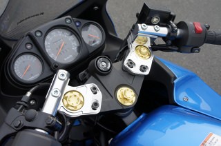 ※画像は、ステムナット(品番:55-69-01)とフロントフォークキャップ(品番:55-69-02)の同時装着例です。ハンドルバー、ハンドルクランプ、10mmアップスペーサーのセット。【仕様】・STDケーブル、ホース対応。・ハンドルバーサイズ:φ22.2×282mm・バーエンドキャップ(樹脂/白)付属・高さ調整範囲(STDハンドル比): -5mmから-35mm・ハンドル幅調整範囲: 670mmから620mm 最大50mm【ポジション】●ポジション1:STD比-5mm・ハンドルクランプ(厚み15mm)+アップスペーサー(厚み10mm)・ハンドル幅:STD位置●ポジション2:STD比-25mm・ハンドルクランプ(厚み15mm)+アップスペーサー(厚み10mm)・ハンドル幅:-10度 ※ハンドル角を絞った角度位置。●ポジション3:STD比-15mm・ハンドルクランプ(厚み15mm)・ハンドル幅:STD位置●ポジション4:STD比-35mm・ハンドルクランプ(厚み15mm)・ハンドル幅:-10度 ※ハンドル角を絞った角度位置。※ハンドルとガソリンタンクのクリアランスが狭くなるので、ハンドルストッパーの取付け推奨。