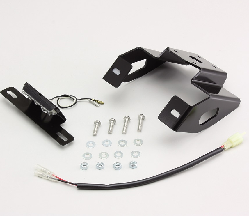 アルミ製、ブラックアルマイト高輝度白色LEDライセンスランプ、専用ハーネス付属ノーマルウインカー取付可