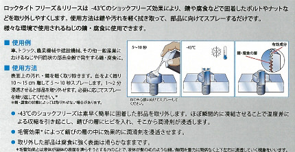 外したい部品の錆や汚れを軽くふき取ってスプレーすると、-43度のショックフリーズ効果により潤滑剤が浸透して、ボルトやナットが取り外しやすくなります。