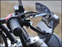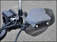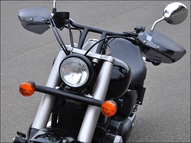 ※フロントブレーキホースなどハンドル周りに変更を加えている場合、ブレーキホースの固定方向によりガントレット本体に干渉する場合があります。走行風よりライダーの拳や指先を保護するナックルガード。シールド本体はポリカーボネイト製です。十分な強度をもたせた取付けステーは高い風圧を受けてもガタツキが出ないように考慮された形状を持ち、左右のミラーに共締めするだけのボルトオン設計です。※純正オプションの「ブルバードスクリーン」との同時装着も可能です。【取付方法】ブレーキ側はマスターシリンダーの形状に合わせたステー形状。回り止めの役目を果たします。クラッチ側はホルダーの隙間にステーを差し込むことで回り止めとしています。
