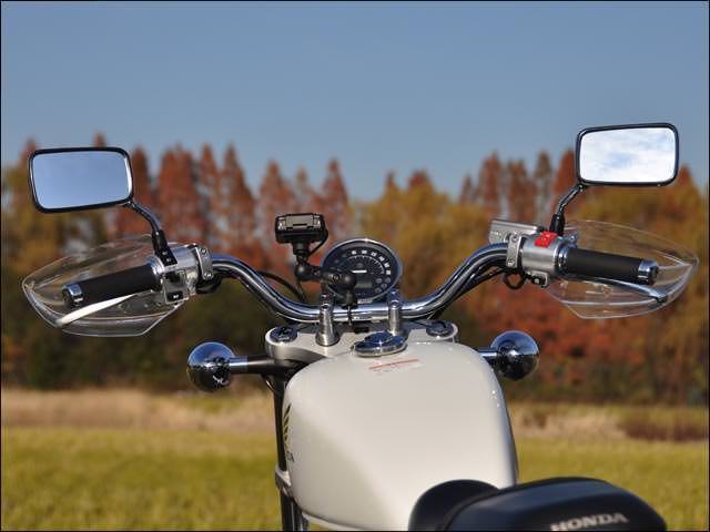 ※フロントブレーキホースなどハンドル周りに変更を加えている場合、ブレーキホースの固定方向によりガントレット本体に干渉する場合があります。走行風よりライダーの拳や指先を保護するナックルガード。シールド本体はポリカーボネイト製です。十分な強度をもたせた取付けステーは高い風圧を受けてもガタツキが出ないように考慮された形状を持ち、左右のミラーに共締めするだけのボルトオン設計です。※純正オプションの「ブルバードスクリーン」との同時装着も可能です。【取付方法】クラッチ側はホルダーの隙間にステーを差し込むことで回り止めとしています。ブレーキ側はマスターシリンダーの形状に合わせたステー形状。回り止めの役目を果たします。