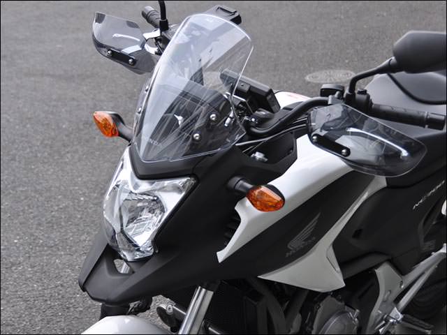 ※フロントブレーキホースなどハンドル周りに変更を加えている場合、ブレーキホースの固定方向によりガントレット本体に干渉する場合があります。走行風よりライダーの拳や指先を保護するナックルガード。シールド本体はポリカーボネイト製です。十分な強度をもたせた取付けステーは高い風圧を受けてもガタツキが出ないように考慮された形状を持ち、左右のミラーに共締めするだけのボルトオン設計です。※純正オプションのロングタイプスクリーンとの同時装着は未確認となります。※DCT仕様車には専用品をご用意しています。DCT仕様車用は(品番:GG63C)。※TypeLDにも装着可。【取付方法】クラッチ側はホルダーの隙間にステーを差し込むことで回り止めとしています。ブレーキ側はマスターシリンダーの形状に合わせたステー形状。回り止めの役目を果たします。
