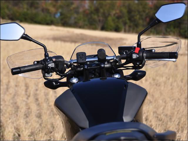 ※フロントブレーキホースなどハンドル周りに変更を加えている場合、ブレーキホースの固定方向によりガントレット本体に干渉する場合があります。走行風よりライダーの拳や指先を保護するナックルガード。シールド本体はポリカーボネイト製です。十分な強度をもたせた取付けステーは高い風圧を受けてもガタツキが出ないように考慮された形状を持ち、左右のミラーに共締めするだけのボルトオン設計です。シックデザイン社製ガイラシールドとの同時装着も可能な設計です。さらに防風性能を高めたいとお考えの方におすすめです。※純正オプションの「ウインドスクリーン/ロングタイプスクリーン」との同時装着も可能です。※DCT仕様車専用品となります。通常モデル(クラッチ付き)用は(品番:)。【取付方法】クラッチ側はスイッチボックスの形に沿わせたステー形状で、パーキングブレーキも通常通り使えます。ブレーキ側はマスターシリンダーの形に合わせたステー形状で、回り止め機能を果たしています。