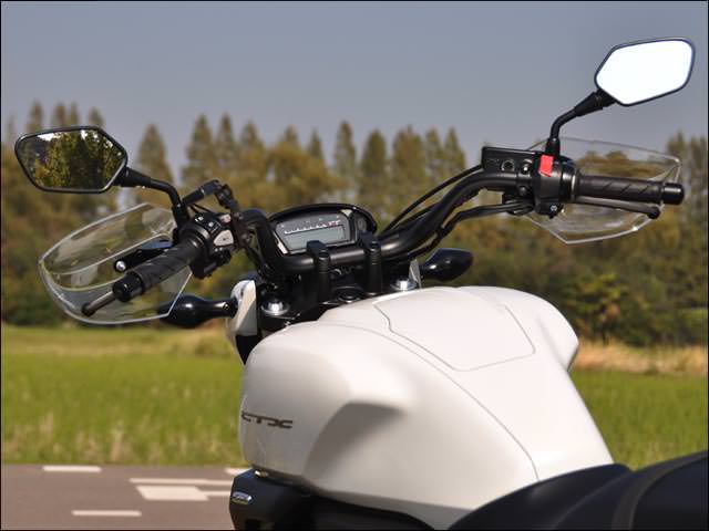 ※フロントブレーキホースなどハンドル周りに変更を加えている場合、ブレーキホースの固定方向によりガントレット本体に干渉する場合があります。走行風よりライダーの拳や指先を保護するナックルガード。シールド本体はポリカーボネイト製です。十分な強度をもたせた取付けステーは高い風圧を受けてもガタツキが出ないように考慮された形状を持ち、左右のミラーに共締めするだけのボルトオン設計です。※DCT仕様車には使用できません。【取付方法】クラッチ側はホルダーの隙間にステーを差し込むことで回り止めとしています。ブレーキ側はマスターシリンダーの形状に合わせたステー形状。回り止めの役目を果たします。