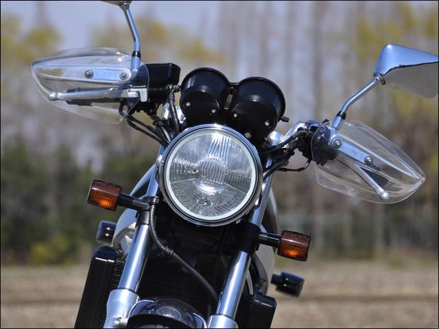 ※フロントブレーキホースなどハンドル周りに変更を加えている場合、ブレーキホースの固定方向によりガントレット本体に干渉する場合があります。走行風よりライダーの拳や指先を保護するナックルガード。シールド本体はポリカーボネイト製です。十分な強度をもたせた取付けステーは高い風圧を受けてもガタツキが出ないように考慮された形状を持ち、左右のミラーに共締めするだけのボルトオン設計です。シックデザイン社製ガイラシールドやビキニカウルシリーズとの同時装着も可能な設計です。さらに防風性能を高めたいとお考えの方におすすめです。【取付方法】クラッチ側はホルダーの隙間にステーを差し込むことで回り止めとしています。ブレーキ側はマスターシリンダーの形状に合わせたステー形状。回り止めの役目を果たします。