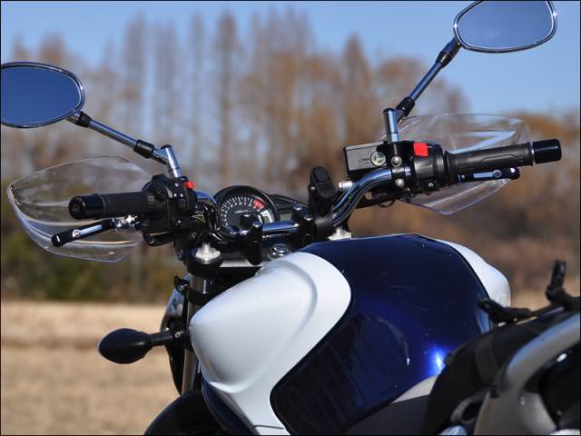 ※フロントブレーキホースなどハンドル周りに変更を加えている場合、ブレーキホースの固定方向によりガントレット本体に干渉する場合があります。走行風よりライダーの拳や指先を保護するナックルガード。シールド本体はポリカーボネイト製です。十分な強度をもたせた取付けステーは高い風圧を受けてもガタツキが出ないように考慮された形状を持ち、左右のミラーに共締めするだけのボルトオン設計です。シックデザイン社製ガイラシールドとの同時装着も可能な設計です。さらに防風性能を高めたいとお考えの方におすすめです。※純正オプションのメーターバイザーセットとの同時装着は未確認となります。【取付方法】クラッチ側はホルダーの隙間にステーを差し込むことで回り止めとしています。ブレーキ側はマスターシリンダーの形状に合わせたステー形状。回り止めの役目を果たします。