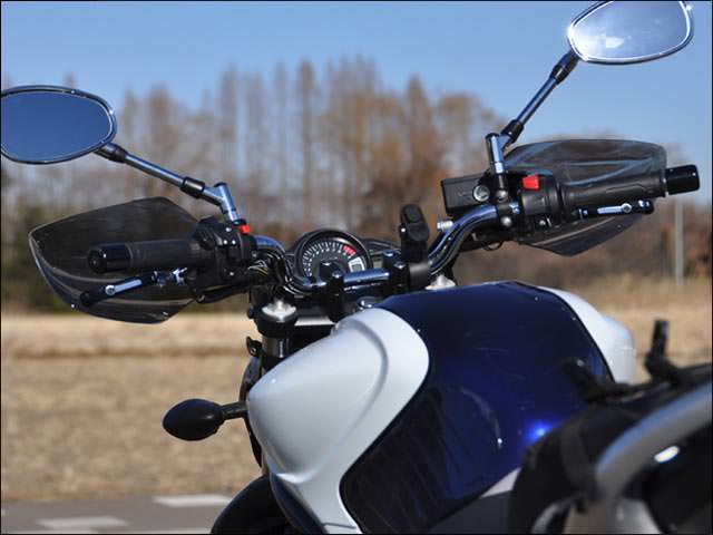 走行風よりライダーの拳や指先を保護するナックルガード。シールド本体はポリカーボネイト製です。十分な強度をもたせた取付けステーは高い風圧を受けてもガタツキが出ないように考慮された形状を持ち、左右のミラーに共締めするだけのボルトオン設計です。
