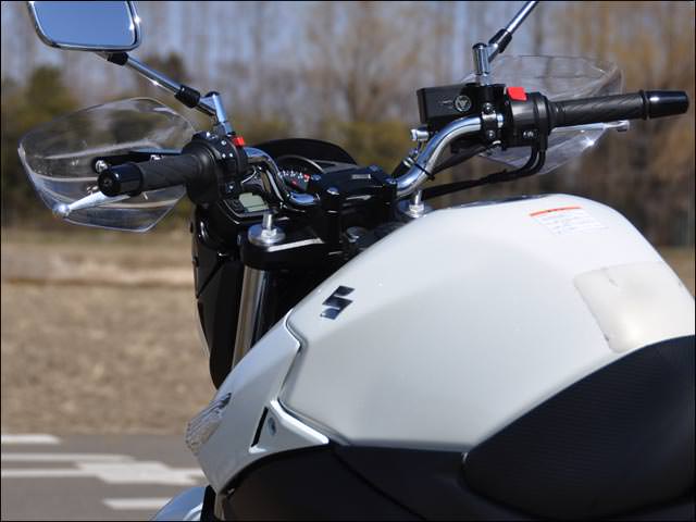※フロントブレーキホースなどハンドル周りに変更を加えている場合、ブレーキホースの固定方向によりガントレット本体に干渉する場合があります。走行風よりライダーの拳や指先を保護するナックルガード。シールド本体はポリカーボネイト製です。十分な強度をもたせた取付けステーは高い風圧を受けてもガタツキが出ないように考慮された形状を持ち、左右のミラーに共締めするだけのボルトオン設計です。【取付方法】クラッチ側はホルダーの隙間にステーを差し込むことで回り止めとしています。ブレーキ側はマスターシリンダーの形状に合わせたステー形状。回り止めの役目を果たします。