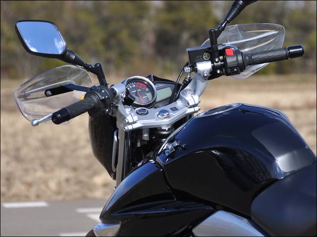 ※フロントブレーキホースなどハンドル周りに変更を加えている場合、ブレーキホースの固定方向によりガントレット本体に干渉する場合があります。走行風よりライダーの拳や指先を保護するナックルガード。シールド本体はポリカーボネイト製です。十分な強度をもたせた取付けステーは高い風圧を受けてもガタツキが出ないように考慮された形状を持ち、左右のミラーに共締めするだけのボルトオン設計です。※純正オプションのメーターバイザーセットとの同時装着も可能です。【取付方法】クラッチ側はホルダーの隙間にステーを差し込むことで回り止めとしています。ブレーキ側はマスターシリンダーの形状に合わせたステー形状。回り止めの役目を果たします。