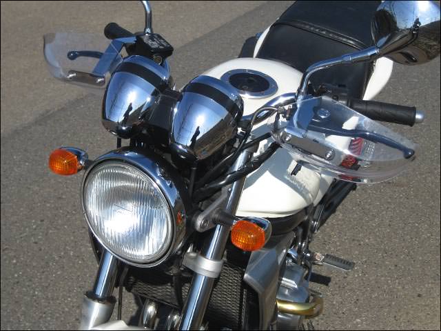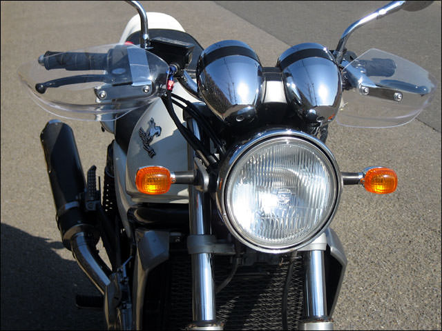 ※画像はバリオス(BALIUS)IIへの装着例です。※フロントブレーキホースなどハンドル周りに変更を加えている場合、ブレーキホースの固定方向によりガントレット本体に干渉する場合があります。走行風よりライダーの拳や指先を保護するナックルガード。シールド本体はポリカーボネイト製です。取付けステーは高い風圧を受けてもガタツキが出ないように考慮された形状でノーマル車両にボルトオン設計です。※シックデザイン社製ガイラシールドやビキニカウルシリーズとの同時装着は未確認となります。