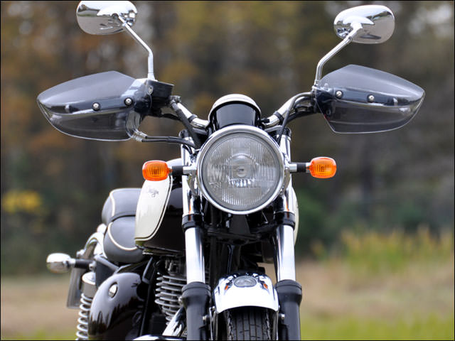 ※フロントブレーキホースなどハンドル周りに変更を加えている場合、ブレーキホースの固定方向によりガントレット本体に干渉する場合があります。走行風よりライダーの拳や指先を保護するナックルガード。シールド本体はポリカーボネイト製です。取付けステーは高い風圧を受けてもガタツキが出ないように考慮された形状でノーマル車両にボルトオン設計です。シックデザイン社製ガイラシールドとの同時装着も可能な設計です。さらに防風性能を高めたいとお考えの方におすすめです。【取付方法】クラッチ側は付属のレバーピンとミラーによる2点止め。ブレーキ側はミラーホルダーに沿うようにステーが折れ曲がり、回り止めの役目を果たしています。