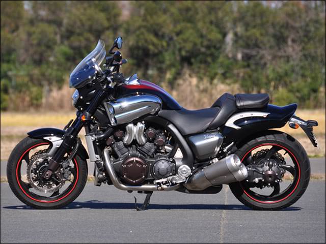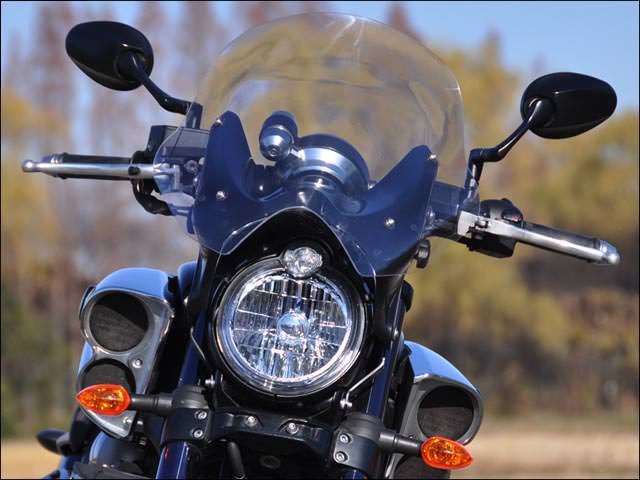 高速クルージングで高い防風効果を発揮する角度可変型ウインドシールド。車体とのバランスを考慮した専用デザインで、ヘッドライト周りに違和感なくマッチします。左右のノブによりスクリーンの角度を無段階に調整することが可能です。メーター左右とライト下部左右の4点マウント。スクリーン本体は3mm厚ポリカーボネイト製(ハードコート仕様)。VMAX(09年~17年)専用スクリーンとなります。シックデザイン社製ガイラガントレット、ワイズギア製リュートブルーミラー、純正ナビとの同時装着も可能です。