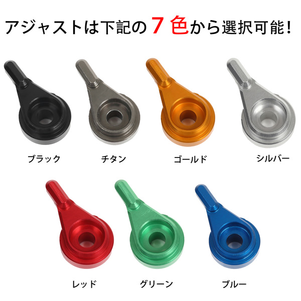 ※取り付け車種により純正レバーに付属する部品をご使用いただく場合がございます。※レバー交換後は必ず異常が無いか確認を行ってください。※モニターの環境等の理由により画像の色と実物の色が若干異なって見える場合がございます。※画像はイメージです。※この商品は予告なしに価格や仕様を変更する場合がございます。※アジャスター(調整つまみ)は写真の7色よりお選びいただけます。高強度アルミニウム合金素材6061を精密加工したレバー本体にアルマイト処理を行うことにより高級感を与え、高精度を実現しました。純正マスターシリンダー、クラッチレバーホルダーに装着できます。握りやすい形状により操作に必要な力を低減。6段階アジャスターにより好みのレバー位置にセッティング可能。手の小さな女性でも快適な操作性を確保出来ます。レバー先端部分で最大約28mmまで調整が可能となっています。レバーが可倒式になっておりますので転倒等の衝撃によるダメージを最小限に抑えます。補修部品を設定しておりますので、破損部品のみの販売が可能となっております。
