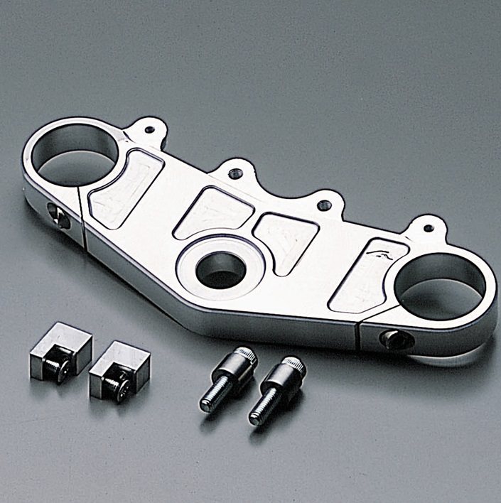 表面フライスカットのトップブリッジは、全製品裏面も肉抜き加工を施し軽量化してあります。マシニングセンターによる精密削り出しでフロントサスの剛性を高め、より攻撃的にグレードアップ。ジュラルミン製ポリッシュアルマイト仕上げ。メインスイッチ、ハンドルロックは、全製品取付可。取付可能なホルダー HB0617 HB0651 HB0652 HB0653 HB0656適合ステムナット HT0803