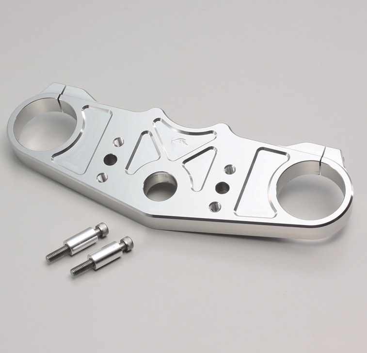 表面フライスカットのトップブリッジは、全製品裏面も肉抜き加工を施し軽量化してあります。マシニングセンターによる精密削り出しでフロントサスの剛性を高め、より攻撃的にグレードアップ。ジュラルミン製ポリッシュアルマイト仕上げ。メインスイッチ、ハンドルロックは、全製品取付可。取付可能なホルダー HB0651 HB0652 HB0656適合ステムナットノーマルを使用して下さい。
