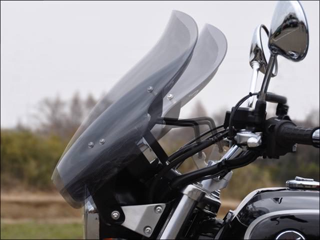 ※純正アタッチメントを使用した【Gathers M ナビゲーションG3】装着車には取付不可。※角度を最も寝かせた状態にすると、スクリーン裏側の取付けボルトの頭が最初に接触します。接触したまま走行すると傷の原因になりますので、角度調整の際にはご注意ください。※掲載画像はクリアのものです。エアプロテクションとスタイリングを高い次元で両立した角度調整機構付きスクリーン。トップブリッジ上の操作により、走行条件に合わせたスクリーン角度を無段階に調整可能。スクリーン本体は3mm厚ポリカーボネイト製(ハードコート仕様)。【仕様】・スクリーンカラー:スモーク・サイズ:Mサイズ・ライト左右のボルト8mm/ライト径は通常のΦ180用
