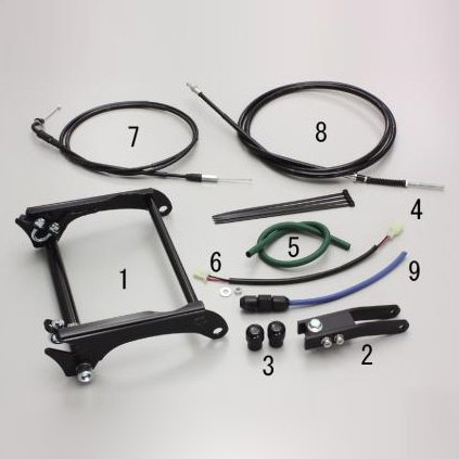※4LV3は取付不可【キット内容】1、エンジンハンガー2、リアサスアダプター3、ナイロンキャップ×24、延長ハーネス チョーク用 300mmロング HD14015、オイルホース7、スロットルケーブル アプリオII:205mmロング HB64018、リアブレーキケーブル アプリオII:205mmロング HB64029、延長プラグコード 200mmロング HD1326ノーマルエアクリーナーOKセンタースタンド不可市販サイドスタンド必要。フルkitのケーブル類の組込内容は、ノーマルハンドル仕様または「ノーマルケーブルでOK」のハリケーン製ハンドルkit装着の場合を基準としています。 ※上記以外のハンドルとの同時装着では、必要なケーブル類が異なる場合があります。※HF1032/1013/1033/1019の適合車種でノーマルキャブレターを使用する場合は、市販のリアサスではキャブレターに干渉する場合がありますのでノーマルサスを使用してください。※ケーブル交換、リアフェンダーのカット作業、ナンバープレート取付位置の移動等が必要です。※ノーマルエアクリーナーからエアフィルターに変更する場合、キャブレターのセッティングが必要です。※般公道ではリフレクター(後部反射器)が必要です。※リアショック・キャブレター・マフラー等を変更する場合は、干渉しないかを十分に確認してください。※エンジンの脱着など取付難易度の高い製品ですので、取付作業はバイクショップ等に依頼してください。