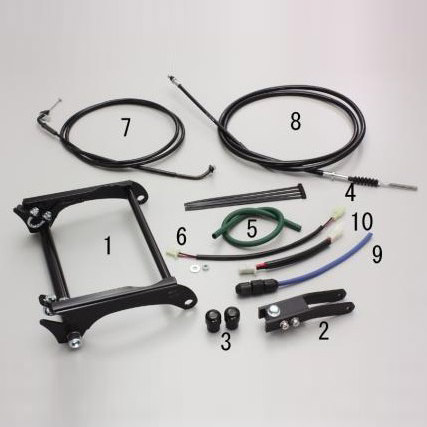 ※7、は2→1本引【キット内容】1、エンジンハンガー2、リアサスアダプター3、ナイロンキャップ×24、延長ハーネス チョーク用 300mmロング HD14015、オイルホース7、スロットルケーブル 100mmロング HB64078、リアブレーキケーブル 150mmロング HB64129、延長プラグコード 200mmロング HD132610、延長ハーネス セル用 180mmロング HD1324ノーマルエアクリーナーOKセンタースタンド不可市販サイドスタンド必要。フルkitのケーブル類の組込内容は、ノーマルハンドル仕様または「ノーマルケーブルでOK」のハリケーン製ハンドルkit装着の場合を基準としています。 ※上記以外のハンドルとの同時装着では、必要なケーブル類が異なる場合があります。※HF1032/1013/1033/1019の適合車種でノーマルキャブレターを使用する場合は、市販のリアサスではキャブレターに干渉する場合がありますのでノーマルサスを使用してください。※ケーブル交換、リアフェンダーのカット作業、ナンバープレート取付位置の移動等が必要です。※ノーマルエアクリーナーからエアフィルターに変更する場合、キャブレターのセッティングが必要です。※般公道ではリフレクター(後部反射器)が必要です。※リアショック・キャブレター・マフラー等を変更する場合は、干渉しないかを十分に確認してください。※エンジンの脱着など取付難易度の高い製品ですので、取付作業はバイクショップ等に依頼してください。