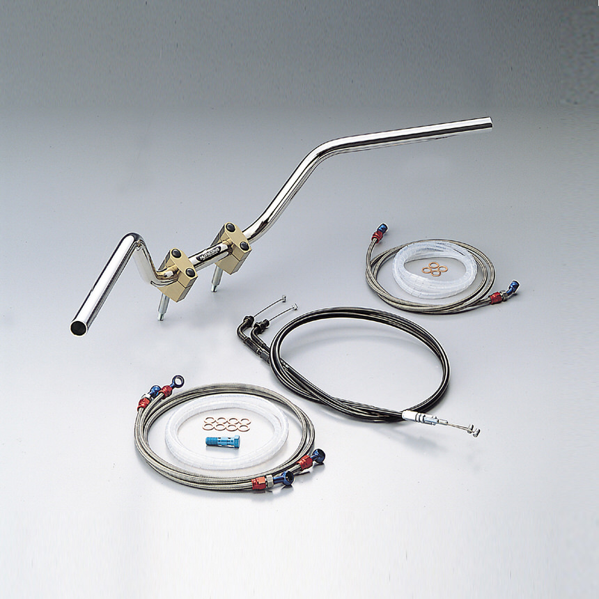 ※スチールハンドル内径Φ18mm用サイドキャップが別途必要※CB1300SF(~00年)は、SC40-1070000迄が適合※別売りハリケーン製ハンドルブレース「Mサイズ」が適合します。ノーマル比ポジション 70mmアップ 90mmバック【kit内容】ZII-TYPE ハンドル クロームメッキ HB0078C-11ヘキサゴン型セットバックホルダー チタン HB0655Tスロットルケーブル 150mmロング ブラック HB6180クラッチホース 100mmロング アルミ HB7P160ブレーキホース 150mmロング 右 アルミ HB7P100 150mmロング 左 アルミ HB7P105Wバンジョーボルト M10 P1.25 アルミ HB7801