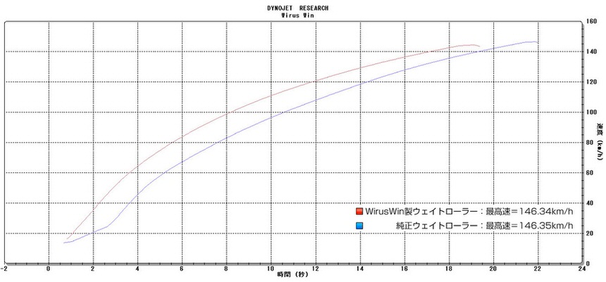 WirusWin製ハイパーウェイトローラーKitと純正ウェイトローラーとの速度比較グラフでは、WirusWin製ハイパーウェイトローラーKitの方がゼロ発進時の速度の立ち上がりが抜群に良く、その差が最高速到達まで続き、結果、最高速到達時間が大幅に短縮されている事が分かります。