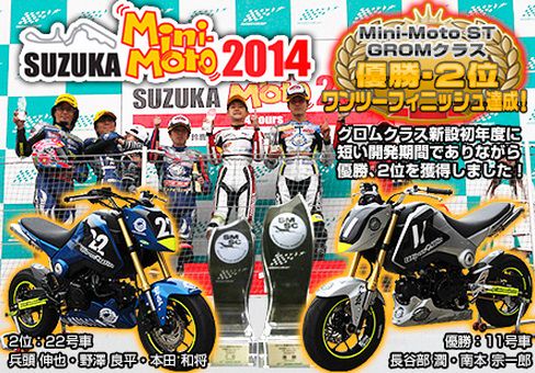 ■受注生産商品となっており、商品手配後 2週間程度入荷にお時間を頂きます。■※平成22年4月1日より施行された認証制度に適合する認証マフラーではありません。ご理解の程よろしくお願い致します。※レース専用マフラーにつき、公道での使用は不可ですのでご注意下さい。※ノーマルステップでも装着可能です。※サーキット走行には Wirus Win製バックステップ をオススメします。2014年鈴鹿 Mini-Moto 4時間耐久ロードレース Mini-Moto ST GROMクラスにおいて、圧倒的な速さで クラス優勝 と 2位入賞 の ワンツーフィニッシュ を果たした脅威のマフラーと、全く同じ仕様の 最強最速 マフラーです。鈴鹿サーキットフルコースで強い登り勾配のS字コーナーからダンロップコーナーでも、グイグイと加速しながら登っていく豊富なトルクと、前車のスリップストリームに入った際に圧倒的な加速を魅せる伸びを両立させた、究極のレーシングマフラーです。また、人気のアトミックツインマフラーのフォルムを意識して、速さと格好良さを求めて製作しました。速さだけでなくビジュアルも抜群な商品です。マフラーの開発は、まずシャーシダイナモ上で幾度となくセットアップ、測定をしてベースセットを決定した後、ウイルズウィンが誇る専属ライダーが実際のコースで走行テスト、開発を行ない、そのインプレッションを元に何十本と仕様変更を重ねて完成させた、究極のレーシングマフラーです。『マフラーだけでここまで変わるのか!』と言ってしまうほど速くなります。レーシングマフラーは、サポートライダーが現状で最高と判断してレースで使用したそのままの仕様を市販化しています。レースで使用した先行開発タイプと市販タイプとの区別をする事無く、現状で最高と判断した仕様を即時フィードバックして製品としておりますので、バイクの仕上がりとライダーの腕次第で十分にトップ争いが可能です。耐久性、耐腐食性の高いオールステンレス製です。装着は加工等必要なくボルトオンで簡単に取り付けできます。排気口先端の形状やサイズなど、規則書で細かく規定されている点も全てクリアしており、何の追加工も必要なく競技車検に合格することができます。音量は性能追求のため競技規則に定められている走行後の音量規制値(99db/A)をクリアする限界を狙って製作しておりますので、体感的にはかなり大きいです。※音量規制の厳しいレースイベント用に、専用バッフル(2個1セット)を3,600(税抜)でご用意しております。装着により約6db音量が下げられます。※レーシングマフラーは更なる性能追求のための常時改良を続けていますので、予告無く仕様変更が施される場合がある事を予めご了承ください。