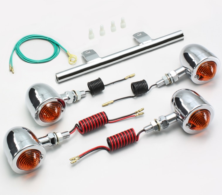 ※シングル球・ダブル球。ステムマウント(パイプステー式) ブレットウインカーキット Φ50mm オレンジレンズオレンジ=オレンジレンズにクリア球組込み。スチール製クロームメッキハリケーン社ウインカーは保安基準による正面から見た灯光部の面積7平方センチ以上の規定をクリアしています。12V10W