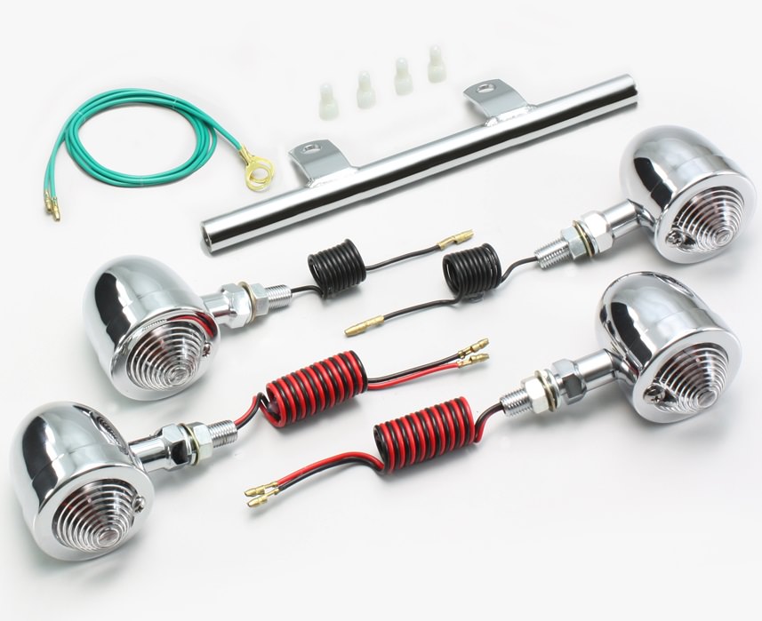 ※シングル球・ダブル球。ステムマウント(パイプステー式) ブレットウインカーキット Φ50mm クリアレンズクリア=クリアレンズにオレンジ球組込み。スチール製クロームメッキハリケーン社ウインカーは保安基準による正面から見た灯光部の面積7平方センチ以上の規定をクリアしています。12V10W