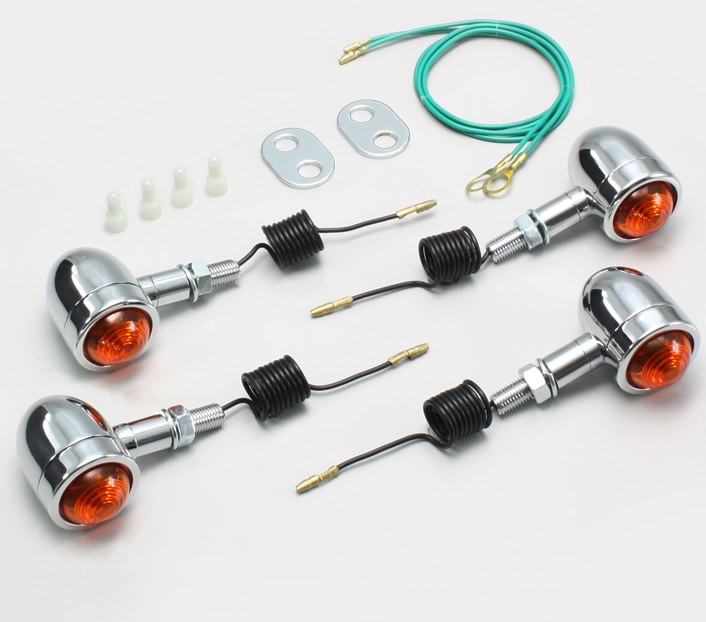 ※シングル球のみ。ステムマウント(プレートステー式) ミニブレットウインカーキット Φ37mm オレンジレンズオレンジ=オレンジレンズにクリア球組込み。アルミ製クロームメッキレンズの止めビスがないシンプルな形状ハリケーン社ウインカーは保安基準による正面から見た灯光部の面積7平方センチ以上の規定をクリアしています。6V10Wアンダーブラケット割締めブルとに取付