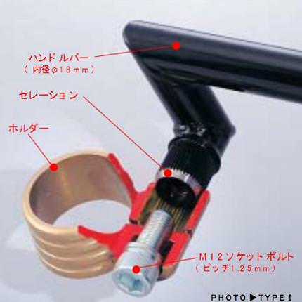 ※画像はイメージとなります。実際の商品とは異なりますのでご注意くださいませ。※ハンドルホルダー【ブラック】・サイドキャップが【シルバー】のタイプとなります。ハンドルバーとホルダーの接合部に高度な技術を要するセレーション加工を施しています。セレーション接合はテーパー接合に比べてスムーズに傾斜角度が変更でき、衝撃時に起こる接合部の「ズレ」を完全にシャットアウトできます。また極太φ12mmソケットボルトを使用し、安全性を一段と向上させています。タンク・メーター等に干渉しない位置に角度調整して取付けできます。ケーブル・ブレーキホース等はノーマルのままで取付OKブラッククロームメッキの上からアクリル塗装による二重防錆処理。スチール製φ22アルミ削り出しサイドキャップ付。※基本的にグリップポジションはノーマルよりアップしません。※スイッチ固定穴は取付角度により位置が変わるため加工しておりません。