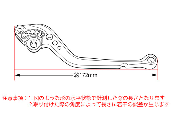 ※取り付け車種により純正レバーに付属する部品をご使用いただく場合がございます。※レバー交換後は必ず異常が無いか確認を行ってください。※モニターの環境等の理由により画像の色と実物の色が若干異なって見える場合がございます。※画像はイメージです。※この商品は予告なしに価格や仕様を変更する場合がございます。高強度アルミニウム合金素材6061を精密加工したレバー本体にアルマイト処理を行うことにより高級感を与え、高精度を実現しました。純正マスターシリンダー、クラッチレバーホルダーに装着できます。握りやすい形状により操作に必要な力を低減。6段階アジャスターにより最大約28mmまで調整が可能となっており、好みのレバー位置にセッティング可能ですので手の小さな女性でも快適な操作性を確保出来ます。※アジャスター(調整つまみ)は写真の7色よりお選びいただけます。商品を発送する際に補修部品のリストを同梱させていただいておりますので、破損や日焼け等があった場合の部品単位での販売も可能となっております。